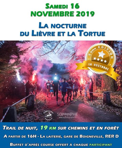 5ème Edition de la Course de nuit "La Nocturne du Lièvre et la Tortue" de 19 km à la frontale et en autosuffisance. Une seule boucle, tout terrain, accessible à tous, idéal pour un 1er trail de nuit. Nouveau parcours empruntant des chemins forestiers avec un dénivelé de 330 m positif.