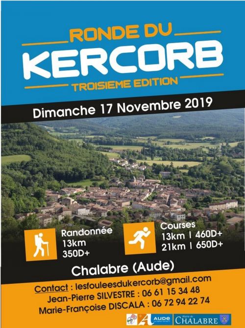 L’Association « Les Foulées du Kercorb » organise un ‘trail découverte’ de 13 km , un trail court de 21 km ainsi qu’une randonnée pédestre de 13 km sur la commune de Chalabre. Les départs seront donnés respectivement à 10h00 et 9h00 et 9h15 depuis la place du village de Chalabre.