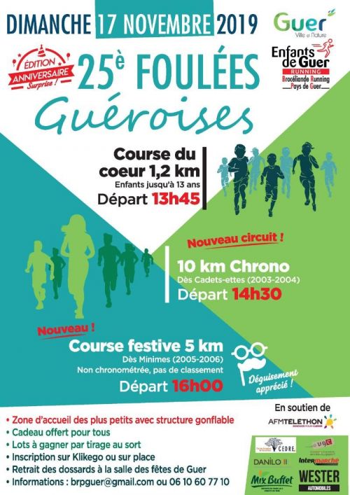Course des 10 km - Trois tours du traditionnel circuit dans le centre ville de Guer. A 16h, course des enfants (1,2 km) au profit du Téléthon. Médaille et diplôme à tous les participants - Inscription sur place (1€) Epreuve ouverte à tous à partir de la catégorie cadet.