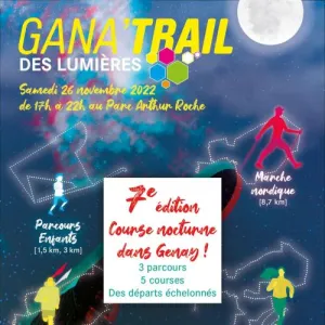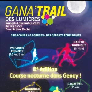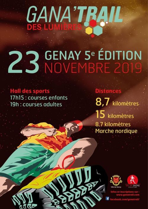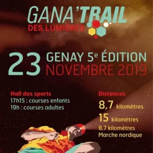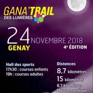 5ème édition de cette course nature à Genay au coeur de l'ancienne province du Franc Lyonnais. Epreuve originale de nuit avec un parcours qui emprunte les rues du village, au patrimoine remarquable avec notamment la magnifique halle du franc lyonnais, et se prolonge dans les chemins environnants sur le plateau qui surplombe le Val de Saône. Lot à tous les participants (Épreuve limitée à 1000 coureurs sur l'ensemble des courses) Animation, repas d'après course organisé et servi par la randoganathaine (association de randonnées pédestres de Genay)