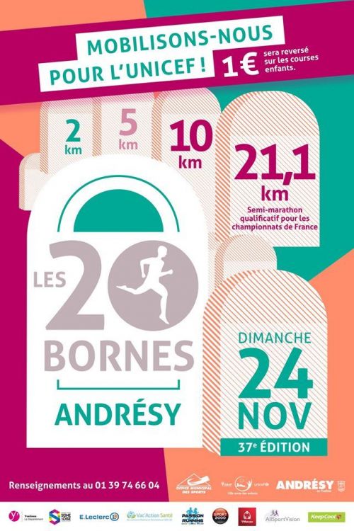 Chaque année depuis 1982 (le dernier dimanche de novembre), plus de 2 000 coureurs se lancent à la conquête des « 20 BORNES » d’Andrésy. Cette épreuve de haut niveau, labellisée et inscrite au calendrier des courses Hors stade de la Fédération Française d’athlétisme, propose des parcours de qualité aux sportifs de haut niveau, aux initiés et non initiés, aux jeunes et moins jeunes, aux handisports… Le semi-marathon est une course qualificative pour les championnats de France.