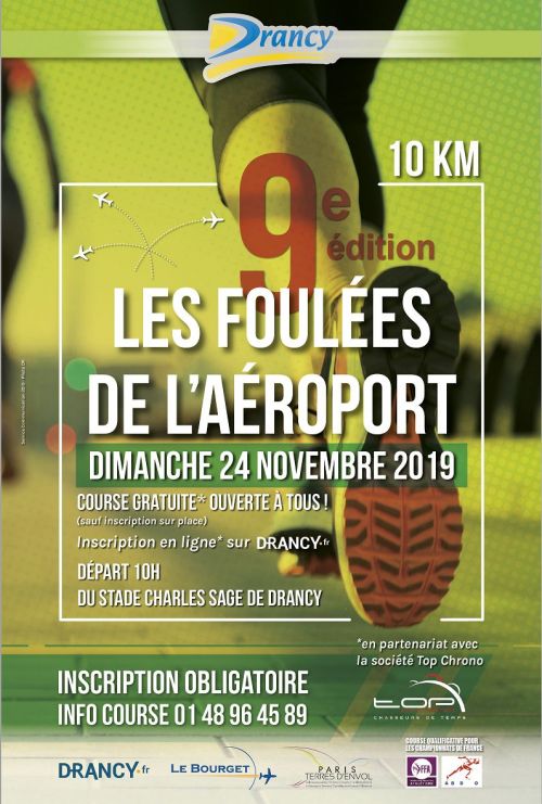 9ème Édition des Foulées de l'aéroport organisée par les villes de Drancy et du Bourget en partenariat avec le club ABDO. Course hors stade de 10 kms labellisé FFA avec un parcours entièrement sécurisé. Ce rendez-vous sportif devenu incontournable propose un parcours de 10 km, sur Le Bourget et Drancy. Gratuite et ouverte à tous à partir de 16 ans, les Foulées de l’Aéroport accueillent chaque année des centaines de coureurs sans condition de niveau.