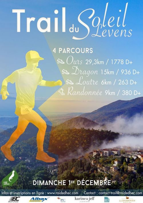 La 5ème édition du trail du soleil levens, organisée par l’association raid edhec, se déroulera à levens, près de nice, avec 700 participants attendus. 4 parcours seront proposés : 29,3km ; 15,6km ; 6,3km et enfin une randonnée de 9,5km.