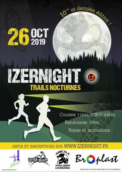 10ème et dernière édition de la Izernight, sur parcours entièrement balisé (90 % de sentiers et chemins). Les départs des trails et de la randonnée se feront au centre du village d’Izernore, et les arrivées au complexe La Vignette.