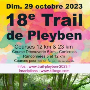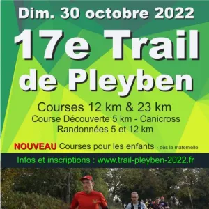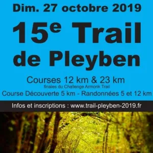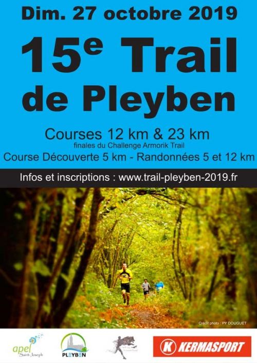 L’APEL de l’école Saint Joseph organise pour la 15ème année le traditionnel Trail de Pleyben. Le parcours vous fera découvrir la campagne pleybennoise tout au long d’un tracé mêlant les sous bois, prairies, chemins creux et passages de rivières, tous les ingrédients des amateurs des courses en nature. L’épreuve fait partie du challenge Armorik Trail dont c’est la troisième édition. La remise des récompenses du challenge aura lieu directement après les courses. 3 Distances proposées 5, 12 et 22 km au départ du gymnase Pierre Cloarec