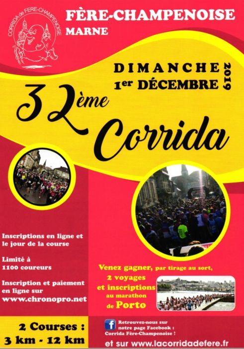 32ème édition de la Corrida de Fère-Champenoise. Un filet de pommes de terre et une récompense inédite pour chaque arrivant du 12 km. De nombreux lots à gagner par tirage au sort des numéros de dossards.