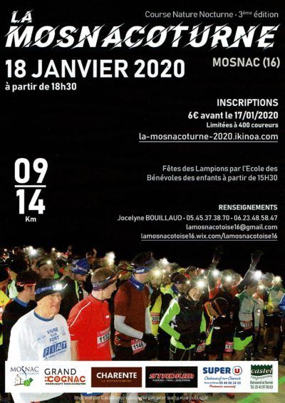L'association ‘’Trail du vignoble cognaçais’’, organisatrice de ‘’La Mosnacotoise’’, souhaite vous faire découvrir, pour la seconde année, les sentiers de la commune de Mosnac, d'une autre façon et vous propose une course nature nocturne. A l'arrivée de la course, en plus du ravitaillement traditionnel vous pourrez vous détendre autour d'un buffet, où mets et boissons chaudes (soupe, café, chocolat, ou encore vin chaud), vous permettront d'apprécier en toute convivialité un repos bien mérité.