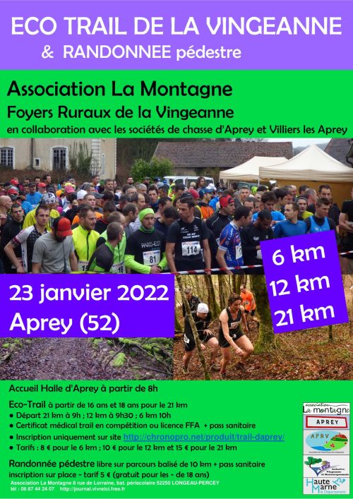 Trail de la Vingeanne à Aprey. ECOTRAIL : Le circuit des gorges de la Vingeanne est un site classé Natura 2000 (site de valeur patrimoniale au niveau Européen), L'écotrail permet de faire découvrir notre territoire et d'en partager les valeurs. NOUVEAUTE CETTE ANNEE : Les 200 premiers inscrits recevront un Lot Randonnée pédestre, marche nordique (10Km) DEPART A 9H