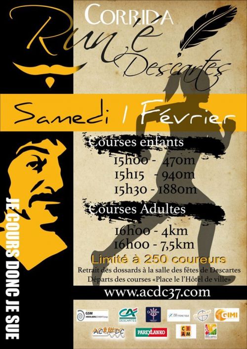 La corrida « Run’E Descartes » est une épreuve sportive organisée par l'Association des Coureurs de Descartes et du Coin. Les 2 courses de 4 km et 7.5 km sont ouvertes à tous les coureurs licencié(e)s ou non. Le départ se fera Place de l’Hôtel de Ville à 15 h 30 et l'arrivée à la salle des fêtes de Descartes. Deux courses enfants seront également organisées.