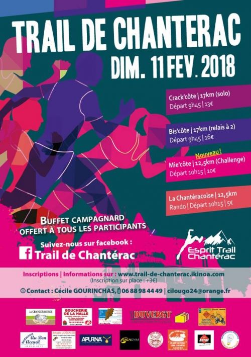 Le club Esprit Trail Chantérac 24 est heureux de vous accueillir dans un cadre champètre et convivial pour vous faire découvrir ses parcours d'entrainement. Au programme : un trail découverte de 17 km, qui pourra se faire seul ou en relais en 2, et une course nature de 12.5 km, inscrite au challenge départemental des courses hors stade de Dordogne 2018. Les randonneurs se feront plaisir sur le parcours du 12.5 km.