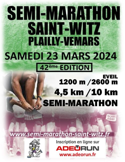 Le parcours du Semi-Marathon est ouvert aux concurrents à partir de la catégorie Junior, il consiste à faire deux boucles identiques qui traversent les villages de PLAILLY, VEMARS et SAINT-WITZ où se situe le départ et l’arrivée. Cette course a été officiellement mesurée et homologuée par la Fédération Française d’Athlétisme. Le Semi-Marathon de SAINT-WITZ fait également partie du Challenge départemental du Val d’Oise.