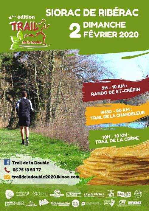 4ème édition du Trail de la Double avec 2 parcours trail et une randonnée. En ce jour de la CHANDELEUR, les bénévoles du comité des fêtes auront le plaisir d'offrir des crêpes lors de l'arrivée à tous les participants ! Plusieurs ravitaillements seront prévus sur les parcours + Buffet à l'arrivée dans la salle des fêtes du village.