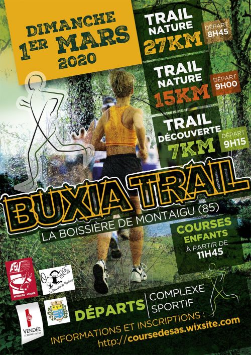 3 trails nature en semi autonomie qui se courre en individuel. Ce sont des épreuves d’environ 27 km, 15km et 7km, qui se dérouleront en une seule étape, au départ du complexe sportif de La Boissière de Montaigu. 3 épreuves dédiées aux enfants : école d’athlétisme, poussins, benjamins et minimes
