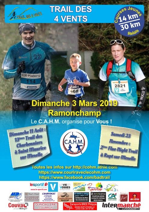 Trail des 4 Vents. Les parcours sont tracés dans la montagne Vosgienne avec 90% de chemins et sentiers balisés. Épreuve du Trail Tour Vosges