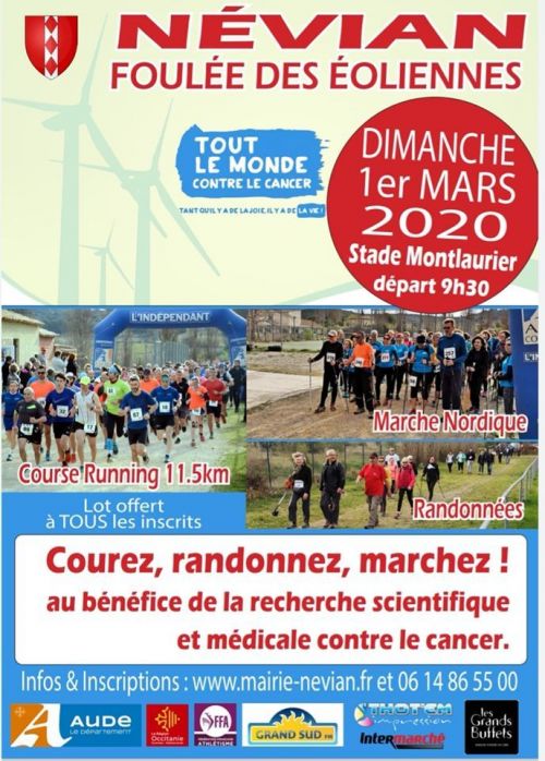 La Foulée des Eoliennes aura lieu au départ et à l'arrivée du Stade Montlaurier de Névian. Comme d'habitude, la Mairie de Névian ainsi que l'ensemble des bénévoles ont préparé cette matinée sportive avec passion et envie de faire découvrir au plus grand nombre ce magnifique territoire névianais.