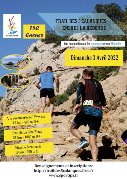 Le trail des 5 Calanques propose 3 épreuves à allure libre : 25 km ou 15 km en trail, et 15 km en marche. Suite aux derniers incendies sur le domaine des calanques une formule de DONS pour entretien et reboissement des sites incendiés sera mise en place lors de l'inscription.