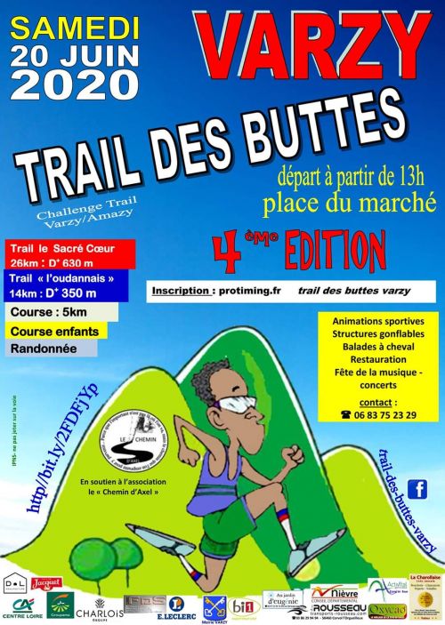 4ème édition du Trail des Buttes de Varzy pleine de surprises . Les inscriptions débuteront le 1 mars sur Protiming. Bienvenue à toutes et tous pour cette 4ème Edition. 3 courses, 5, 14 et 26 km et courses enfants gratuites. Randonnées, animations sportives. Courses accessibles, avec licences ou certificat médical de moins d'un an. Cette année, nous sommes heureux d'accueillir l'association Le Chemin d'Axel. 1€ par dossard leur sera reversé.