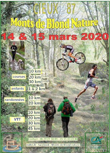 9ème édition de Monts de Blond Nature, au départ de Cieux, dans le cadre superbe du Logis des Treilles (camping municipal) et sur 3 distances : 10 km, 20 km, 30 km. L’objectif principal de cette manifestation est de permettre au plus grand nombre de découvrir le patrimoine et la beauté des paysages des Monts de Blond dont une partie des sentiers est inscrite au plan départemental des itinéraires et promenades de randonnée (PDIPR) : le rocher des fées, la carpe, les étangs de Fromental, du Brudoux, du Petit-hors, de nombreux hameaux…