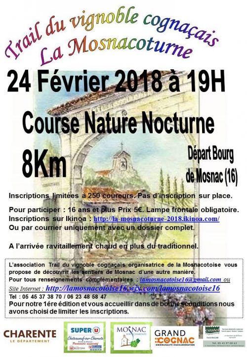 L'association ‘’Trail du vignoble cognaçais’’, organisatrice de ‘’La Mosnacotoise’’, souhaite vous faire découvrir les sentiers de la commune de Mosnac, d'une autre façon et vous propose une course nature nocturne. Pour cette 1ère édition et afin de vous accueillir au mieux nous avons souhaité limiter le nombre de coureurs à 250.