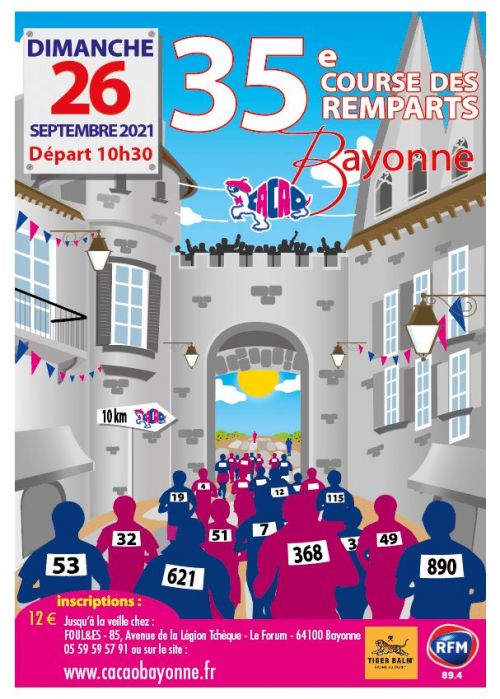 Course des Remparts de Bayonne. Départ et arrivée sur le rempart Lachepaillet, face à l’entrée de la peña CACAO. La course de 10 kms empruntera les remparts, les douves et nos belles rues de Bayonne.