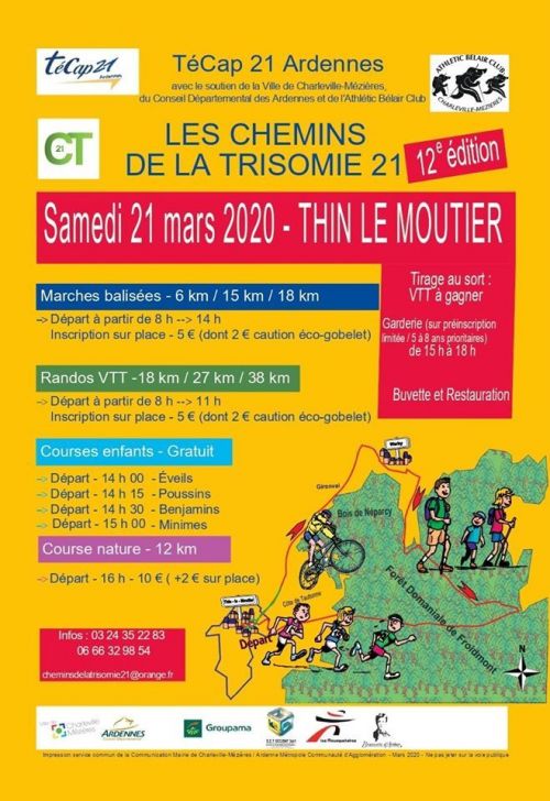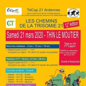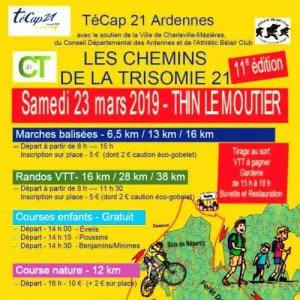 Journée organisée par l'association Trisomie 21 Ardennes. A chacun son défi !.. parcours marches, vtt / courses réservées aux jeunes à partir de 14h30 / Trail nature (16 heures), les Chemins de la Trisomie proposent un parcours sur les chemins et sentiers (forêt de Thin le Moutier)