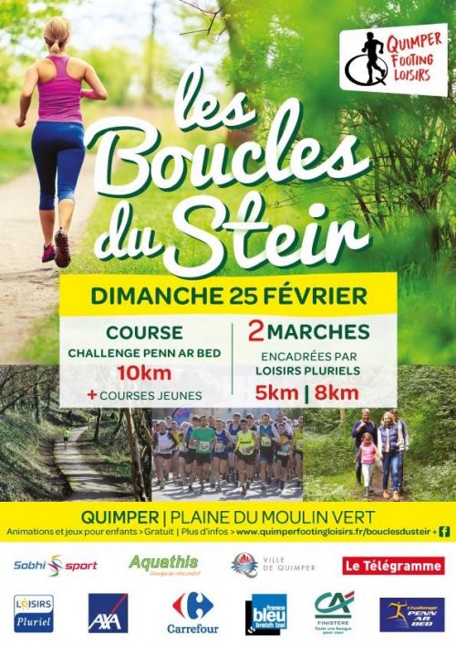 L'association QUIMPER FOOTING LOISIRS organise une journée sportive, qui a pour ambition de rassembler plus de 700 sportifs et autant de spectateurs dans diverses épreuves de course à pied empruntant les plus beaux chemins du quartier du MOULIN VERT à QUIMPER. Nous avons choisi de l’appeler « les boucles du Steir » pour les sentiers qu’elle emprunte le long de cette rivière. Le site est vaste, il permet d’accueillir un public nombreux, qui pourra aisément suivre l’évolution des coureurs de part et d’autre de la plaine qui est le point central des courses.