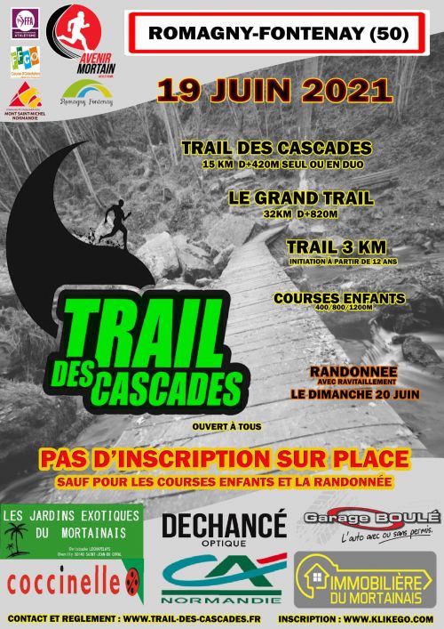 Trail en Solo ou Duo Ouvert de Cadets à Vétérans (masters). Une seule boucle avec 90 % de chemin. Particularité : passage par La Petite Chapelle de Mortain, la cote 314, les 2 cascades de Mortain et l’Abbaye Blanche Solo : boucle effectuée par un seul coureur Duo : boucle effectuée par 2 coureurs / changement à mi-course au lieu dit « champ de la fête à Neuneu », Le Neufbourg . Navette pour ramener le premier coureur au lieu de départ. Classement au cumul du temps des 2 coureurs