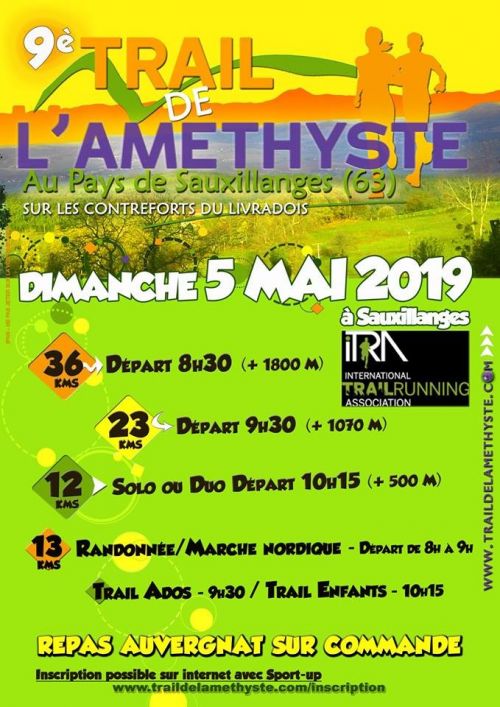 Le prochain trail de l’Améthyste vous promet beaucoup de plaisir : des parcours pour tous : Trail Découverte 12kms, Trail Aventure 23 km et Trail Epopée 36 kms , 13 kms proposés en randonnée ou marche nordique, sans oublier les nouveaux Trail Ados avec classement (12 à 15 ans) et Trail Enfants (5 à 11 ans). Et bien sûr le repas auvergnat pour les amateurs.
