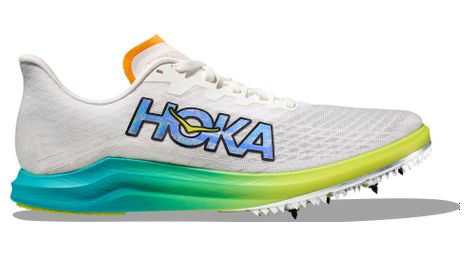Chaussures athletisme hoka unisexe cielo x 2 ld blanc bleu jaune legerete propulsion exaltation produit de pointe concu pour les athletes d elite les nouvelles cielo x 2 ld perfectionnent l experience de le running sur de longues distances grace a une semelle intermediaire plus haute creee grace a un processus de moussage supercritique cette chaussure de vitesse avec plaque en carbone permet une foulee plus rapide plus reactive que ses predecesseurs concue pour de longues distances 3k a 10k la cielo x 2 ld est prete a parcourir la piste avec une tige en maille respirante maille en lacet processus de moussage supercritique de la semelle intermediaire plaque en fibre de carbone plaque en pebax avec 4 pointes